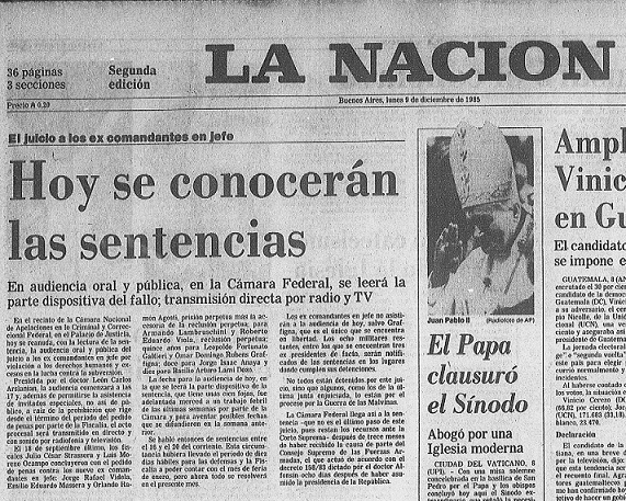 Tapa de La Nación acerca de la finalización del Juicio a las Juntas, 9/12/1985.
