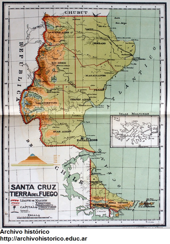 Mapa de las provincias de Santa Cruz y Tierra del Fuego elaborado por Franz Kühn en el año 1950. Escala cartográfica: gráfica. Referencia bibliográfica: Kühn, F. (1950). Atlas general: preparado especialmente para el uso de las escuelas de la República Argentina. Buenos Aires: A. Kapelusz.