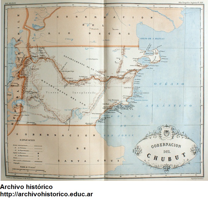 Mapa de la gobernación de Chubut elaborado por Mariano Felipe Paz Soldán en el año 1887. Escala cartográfica: 1:3125000. Tamaño: 37,5 cm x 31 cm. Referencia bibliográfica: Paz Soldán, M. F. (1887). Atlas geográfico de la República Argentina. Buenos Aires: Libr. de F. Lajouane.