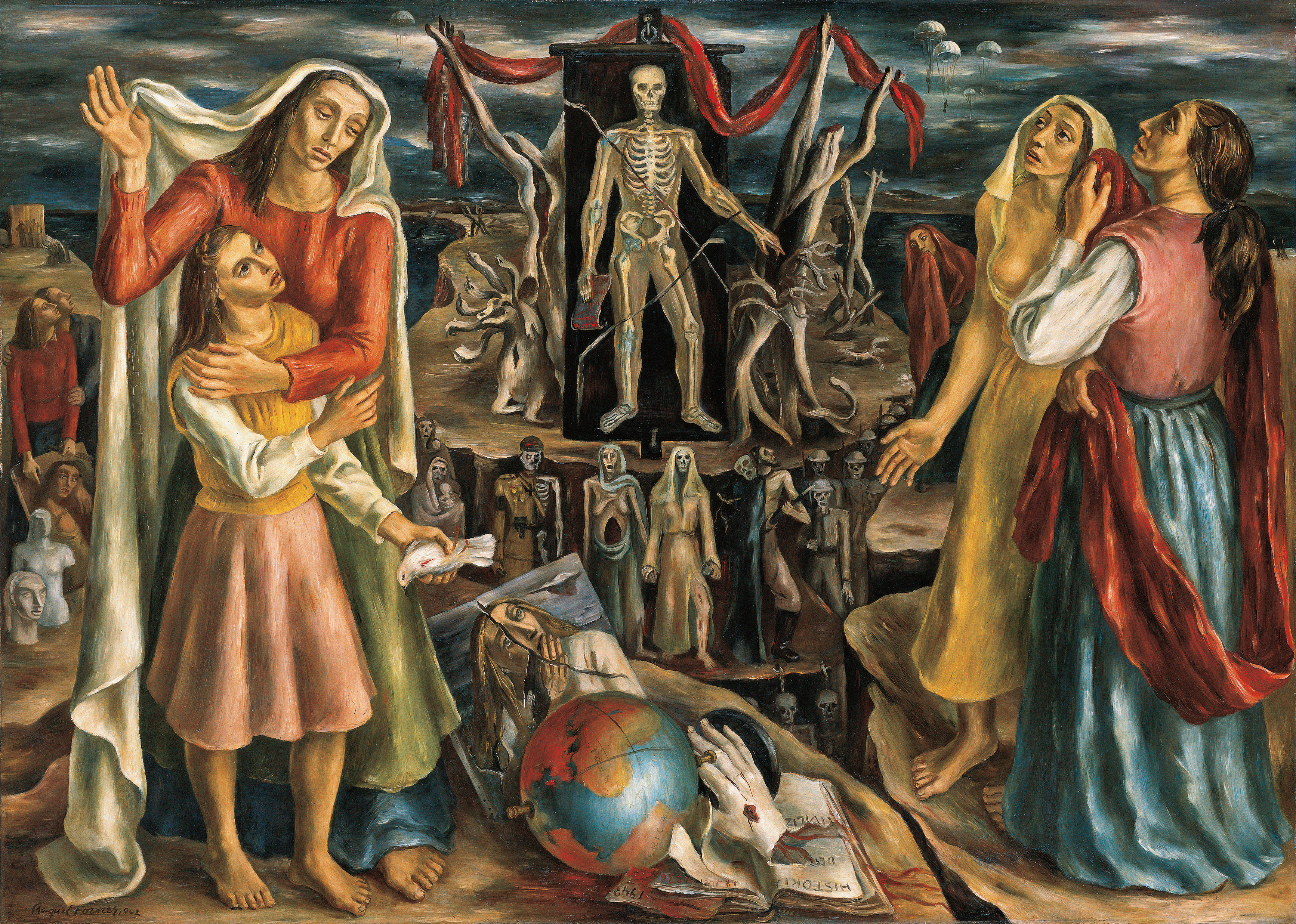 En El drama, tras unas monumentales mujeres dolientes se alza un desolador paisaje, en cuyo centro compositivo se encuentra la muerte ante sus múltiples víctimas: soldados y mujeres. El primer plano presenta una extraña naturaleza muerta conformada por objetos dispares ―recurso deudor del surrealismo― que simbolizan la inestabilidad: una imagen de mujer quebrada, un mundo caído ante el desgarro de la mano que lo sostenía y sangre sobre un libro en el cual leemos la palabra «historia».