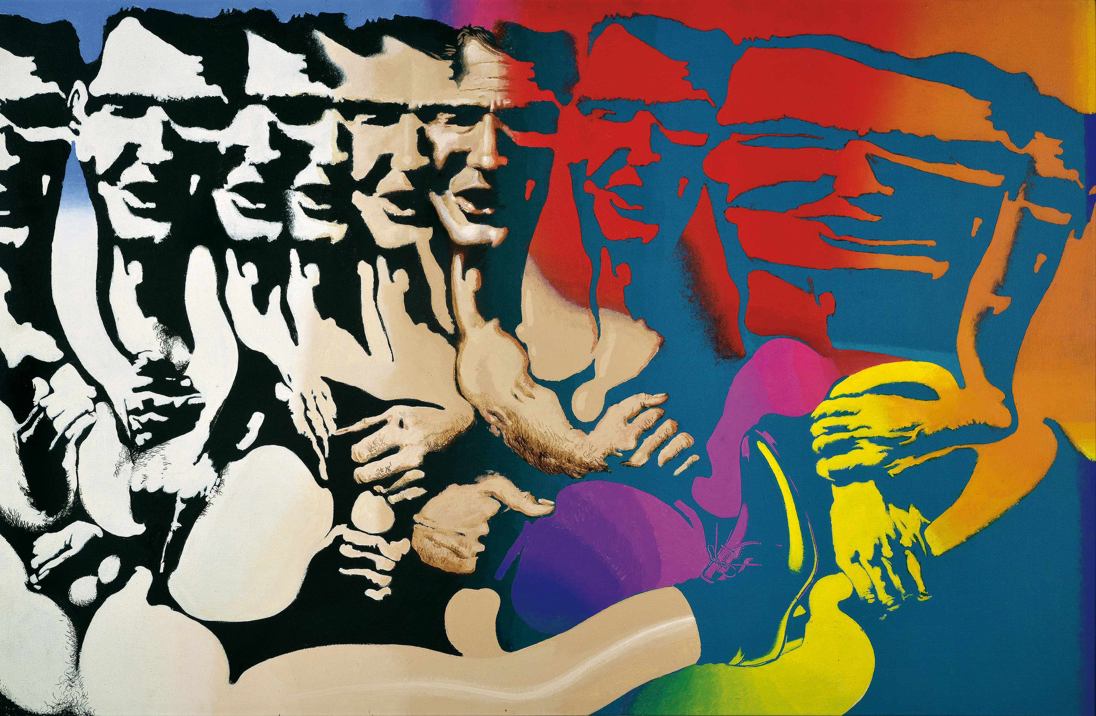 En 1965, De la Vega ganó uno de los pocos reconocimientos a su prolífica carrera, una beca para estudiar hasta 1968 en Estados Unidos, en donde también trabajó como profesor en la Universidad de Cornell. Allí, el artista conoció el mundo americano de posguerra, marcado por el auge del consumo, la publicidad y la psicodelia, aspectos de la vida que rápidamente incorporó a su obra. Abandonó la gestualidad y su figuración pasó a ser más gráfica, deudora del uso del esténcil y de figuras tomadas de la publicidad. En esta imagen, una cara se repite en blanco y negro y vira hacia una brillante paleta, permitida por el empleo de acrílico. Tomando sus palabras, se dedicó a pintar la felicidad de los americanos, que aquí se puede notar en la vitalidad que la obra trasmite. Posteriormente, de pintar lo pop pasó a cantarlo, al dedicarse a escribir música con gran frescura y a combinarla con la plástica en exposiciones.