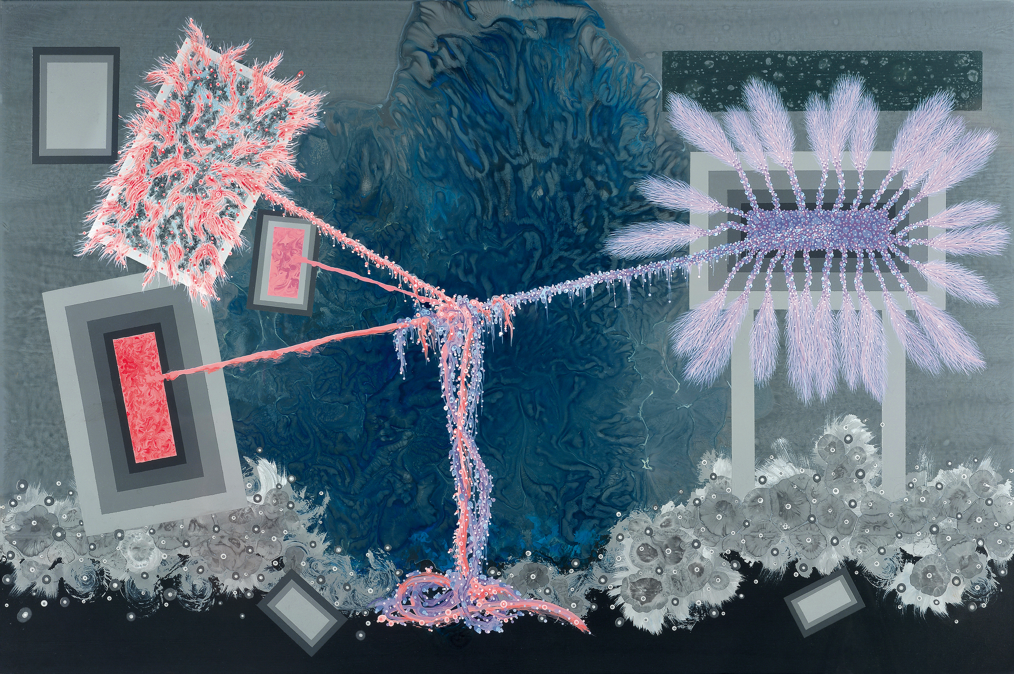 Este extraño paisaje de Marcelo Pombo es atractivo, el rosa y el violeta pastel se destacan sobre el gris y un azul que tiene una textura de piedra preciosa. Pombo utilizó esmaltes sintéticos, un material «bajo», que da una superficie pulida. Además, implica una técnica «menor» pero minuciosa, una tarea de oficio casi artesanal. Todo apunta a gustar más que provocar.