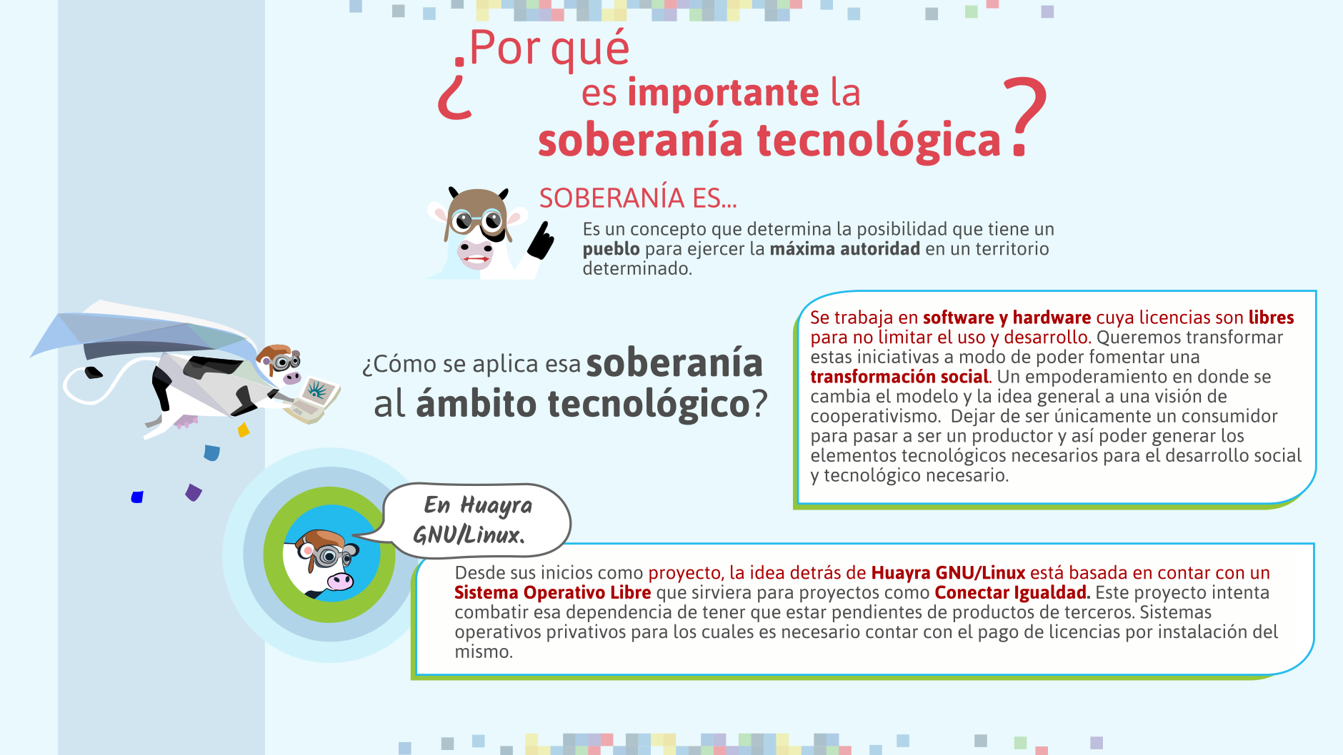 En el ámbito de la soberanía tecnológica, la idea fundamental está dada por aquella tecnología que se desarrolla desde y para un ámbito civil. Estas iniciativas tienen por intento generar opciones ante aquellas tecnologías que son comerciales o militares. Traduciendo estas acciones a una responsabilidad social, de transparencia que generan confianza, se trabaja en software y hardware cuyas licencias son libres para no limitar el uso y desarrollo. Queremos transformar estas iniciativas a modo de poder fomentar una transformación social, un empoderamiento en donde se cambia el modelo y la idea general a una visión de cooperativismo. Hay intercambios genuinos entre las diferentes partes que participan de dichos proyectos. Se intenta abarcar un empoderamiento hacia el conocimiento mismo de la tecnología, dejar de ser únicamente un consumidor para pasar a ser un productor y así poder generar los elementos tecnológicos necesarios para el desarrollo social y tecnológico necesario.