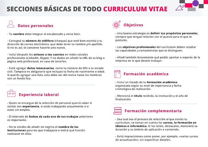 Aunque existen distintos tipos de currículum según el formato y el diseño, hay información que todos deben incluir, datos imprescindibles para quien hace la selección de personal. Se trata de las secciones básicas de todo CV (hacé clic acá para descargarlas).