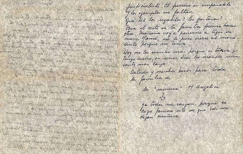 María Angélica Sabelli fue una de las 16 víctimas de los fusilamientos de Trelew. El Archivo Nacional de la Memoria guarda las cartas que le escribía a su familia mientras estaba presa en el penal de Rawson. Esta es una carta de ella del 26 de junio de 1972, dos meses antes de la masacre.