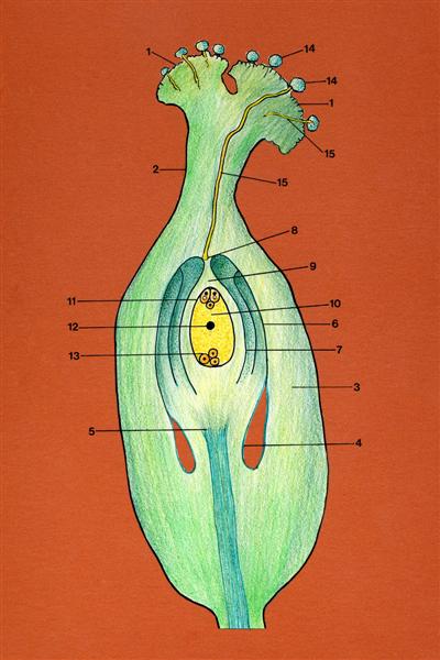 Imágenes de flores que pertenecen a esta categoría y de sus distintas formas de polinización. Se incluye un esquema que ilustra las partes de la flor y cada imagen tiene un breve texto explicativo.
