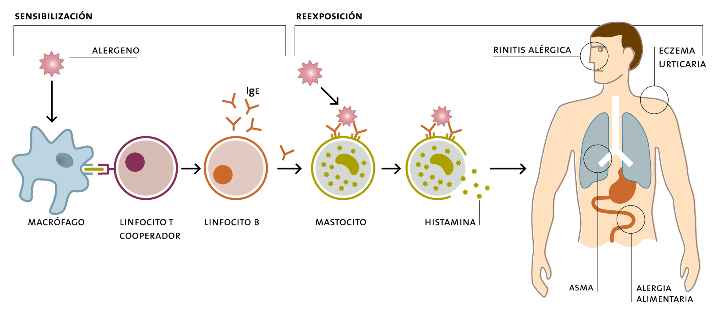 Esta lámina esquematiza el proceso que desencadena una reacción alérgica.